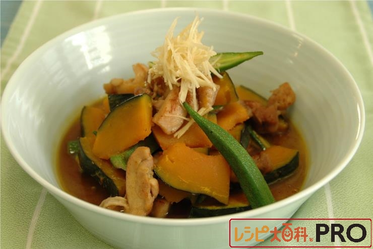 フライパンに油を熱し、鶏肉を炒め、色が変わったらかぼちゃを加えて炒める。油が回ったらAを加え、煮立ったら4分煮て、オクラを加えてひと煮する。