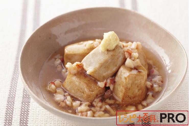 耐熱皿に、かぶの葉、油揚げを入れてラップをかけ、