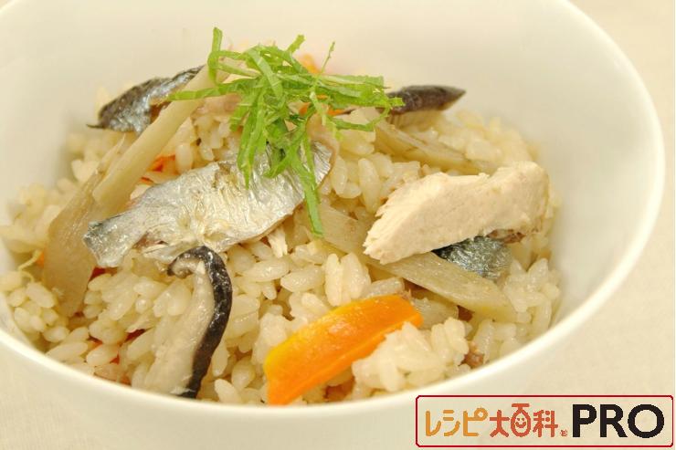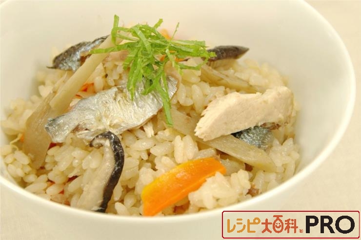 炊飯器に洗った米、Aを加えて混ぜ合わせ、さんまをのせて炊く。