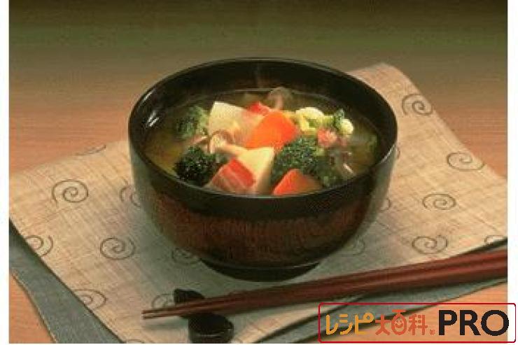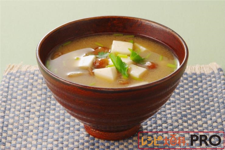 玉じゃくしにみそを入れ、煮汁で溶きのばす。椀に盛り、みつばを散らす。