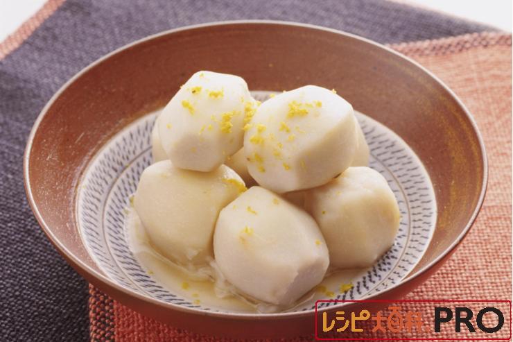 Bを加え、落としぶたをして、煮汁が少量になるまで煮、フタをはずして鍋返しし、少なくなった煮汁を里いもにからめるようにころがす。