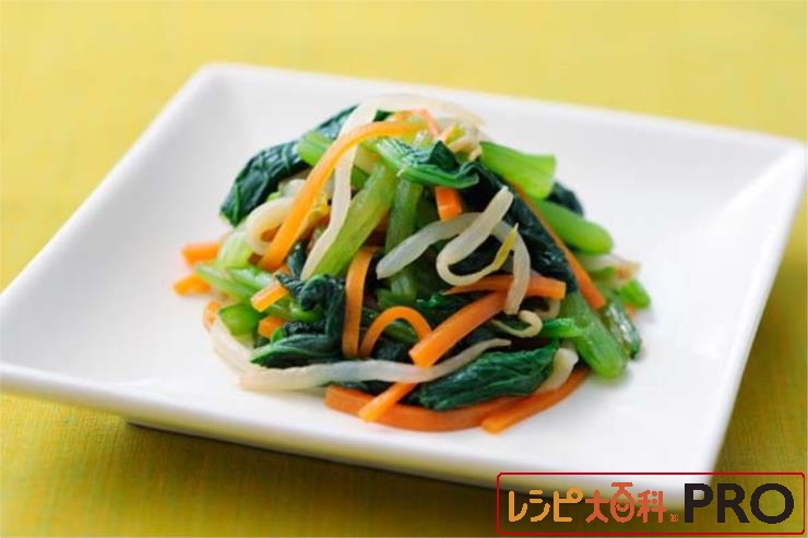 鍋にA(0.3%の味の素水)を入れ沸かし、にんじん、時間差で、もやし、小松菜をゆでる。