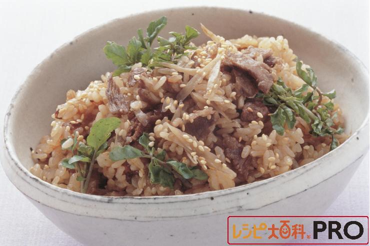 フライパンに油を中火で熱し、牛肉を炒めて肉の色が変わったら、水気をよくきったごぼうを炒め合わせる。洗った米を加え、全体が重たくなるぐらいまで2~3分炒め合わせる。