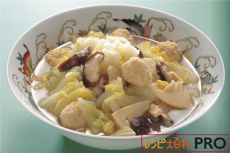 鍋にBを入れて煮立て、(1)を入れて火を通す。肉だんごは端に寄せ、白菜の軸、たけのこ、しいたけを入れてサッと煮立てる。白菜の葉を入れてしんなりしたら、大根おろしを加えてひと煮立ちさせる。