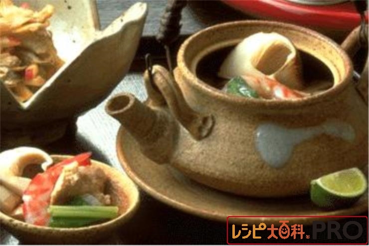土瓶に、まつたけ・えび・鶏肉、ぎんなんを入れて(3)を注ぎ、火にかける。ひと煮立ちしたところで火からおろし、みつばを入れてフタをし、すだちを添える。