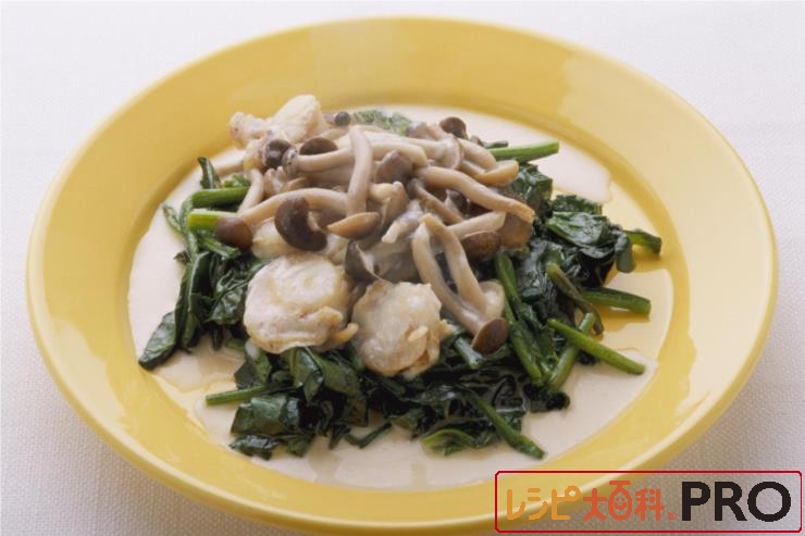 Aでサッとゆでたほうれん草を皿に盛り、(1)の帆立貝柱をのせ、(2)のソースを全体に回しかける。