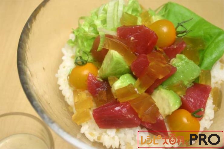 器に(4)を盛り、レタスを敷き、マグロ、さいの目に切った(1)、ミニトマトを盛りつけ、(5)を添える。