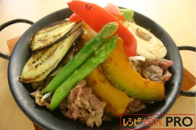 ジンギスカン鍋に(1)をひき、その上にBを盛りつける。