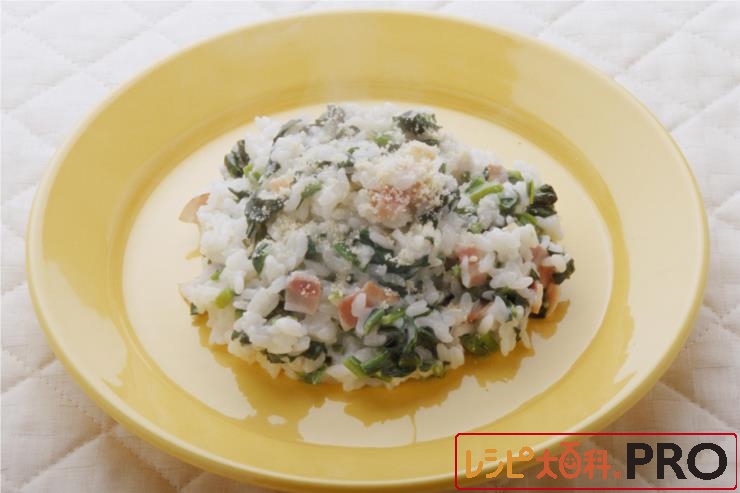 鍋にAを入れ、しばらく煮、ご飯、ほうれん草を加え塩・こしょうで味を調える。