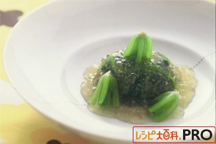 器にほうれん草の葉の部分を盛り、(2)のゼリー適量をかけて、ほうれん草の根元をのせる。