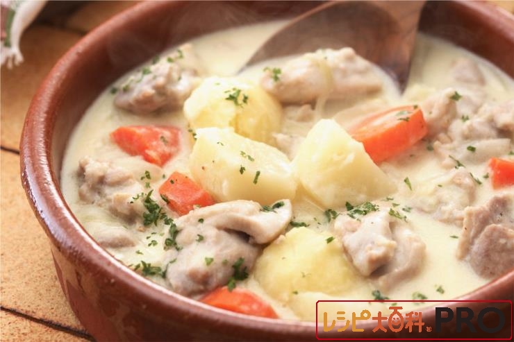 牛乳を加えて塩・こしょうで調味し、煮立ってきたら、火を弱めて、バターを切るように混ぜたCを溶き入れてとろみをつける。仕上げにパセリを散らす。