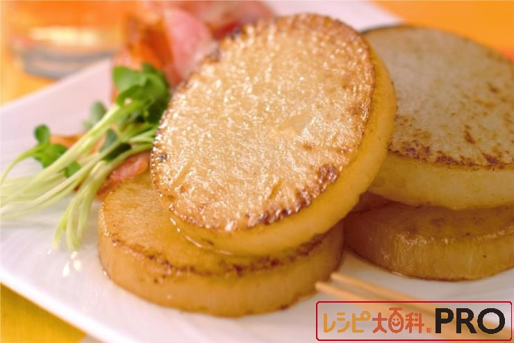 フライパンにバターを熱し、半分溶けた状態で(1)の大根を加え、両面に焼き目がつくまで焼く。しょうゆで味つけをし、ベーコンを加えて軽く炒める。