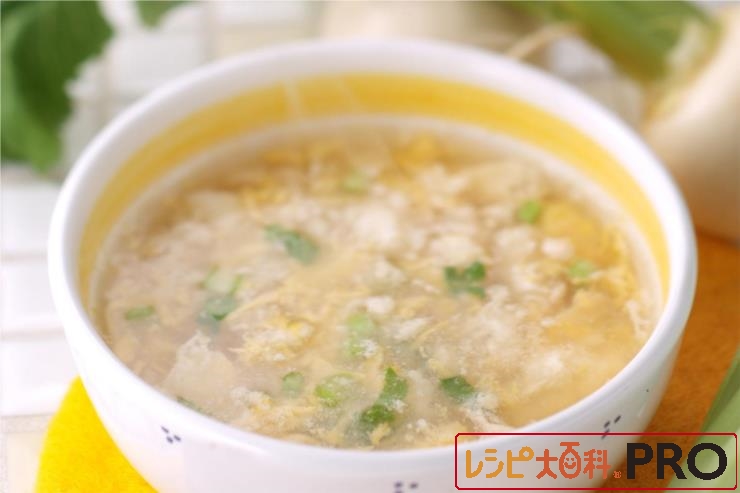 スープが煮立ったら、かき混ぜながら、溶いた卵白・卵黄をそれぞれ少しずつ流し入れ、塩を加え、味を調える。