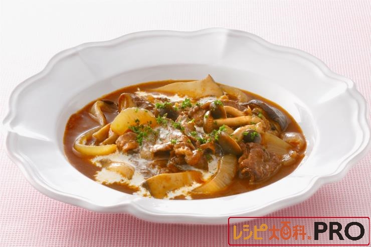 鍋にバター、油各半量を熱し、牛肉を入れて焼き目をつけ、玉ねぎを加えて炒める。
