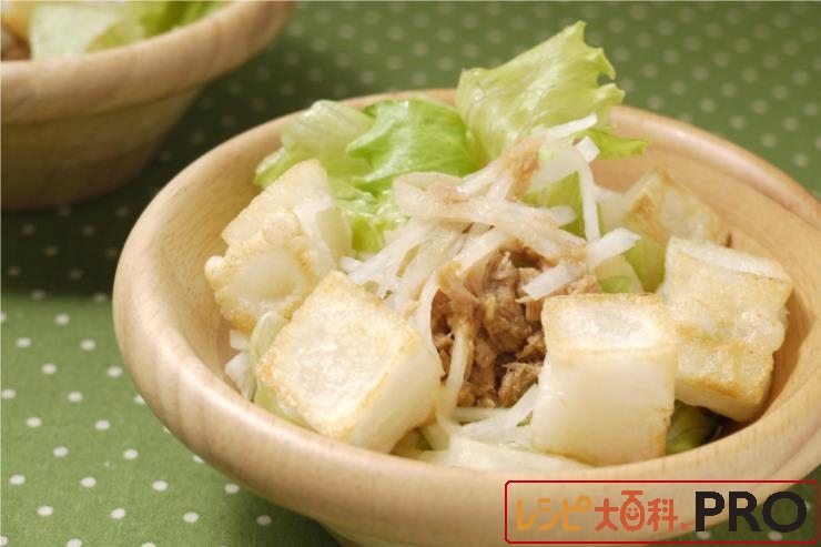 皿にレタスを敷き、混ぜ合わせたA、大根、(1)の揚げ餅の順に盛る。