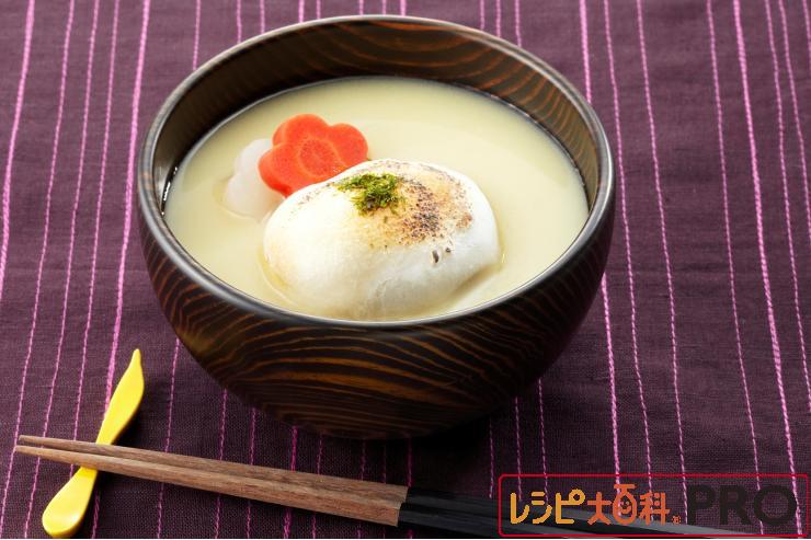 お椀に(2)の具を盛りつけ、白みその汁をはり、餅の上に青のりをふる。