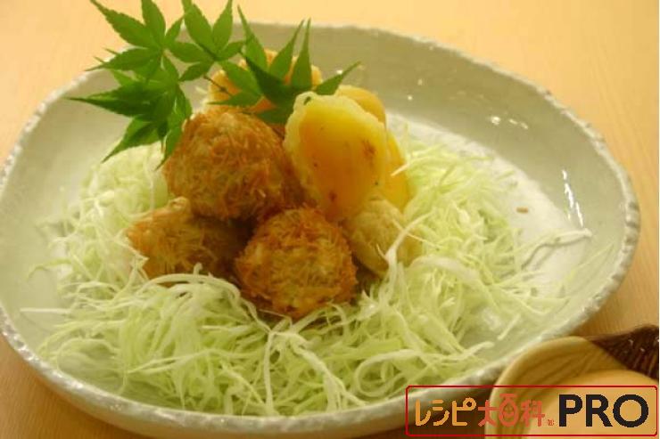 (1)にたこ焼きをくぐらせ、細かく砕いたそうめんをまぶす。