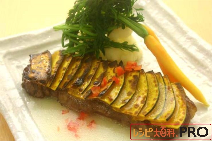 スライスしたかぼちゃをステーキの上に重ねたステーキ。ハロウィン時期にもおすすめ。