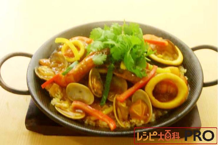 炊き込みチャーハンに、魚介のだしがきいたトマトのあんをかけ人気のパエリア風に。