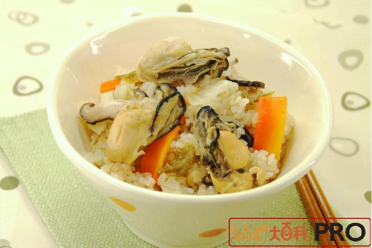 炊飯器に洗った米、(1)を調味料ごと入れ、かきをのせる。分量の水を加えて炊く。