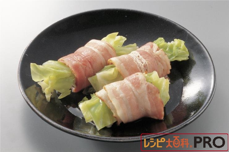 キャベツを2~3枚重ね、ベーコンで巻いて楊枝で留める。