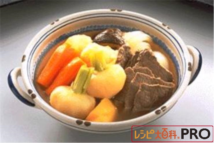 鍋にAを入れて火にかけ、にんじんとじゃがいもがやわらかくなったら牛肉を加えて火を通し、塩・こしょうで味を調える。