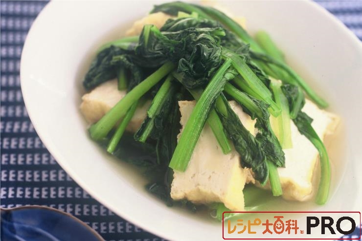 厚揚げを鍋の端に寄せ、あいたところに小松菜を加えて1~2分煮る。小松菜がしんなりとしたら、煮汁ごと器に盛る。