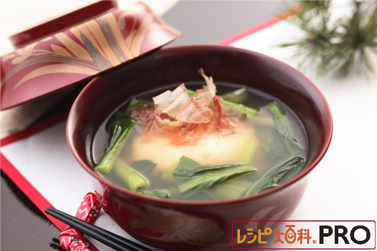 椀に餅・小松菜を盛り、汁を注ぎ、削り節をのせる。