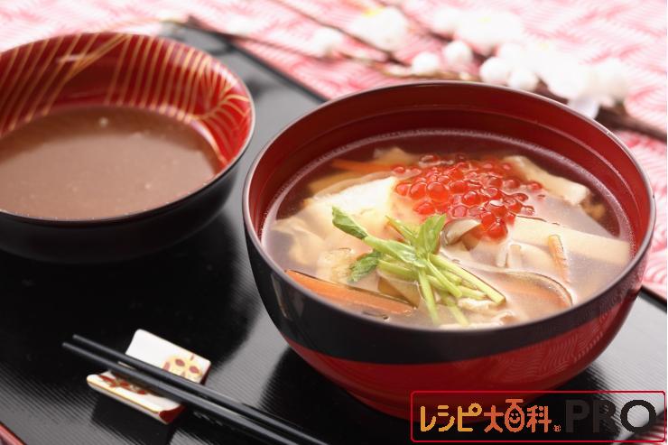 椀に餅を盛り、上から(2)の具と汁をたっぷりかけ、いくらをのせ、せりを散らす。餅にくるみだれをつけて食べる。