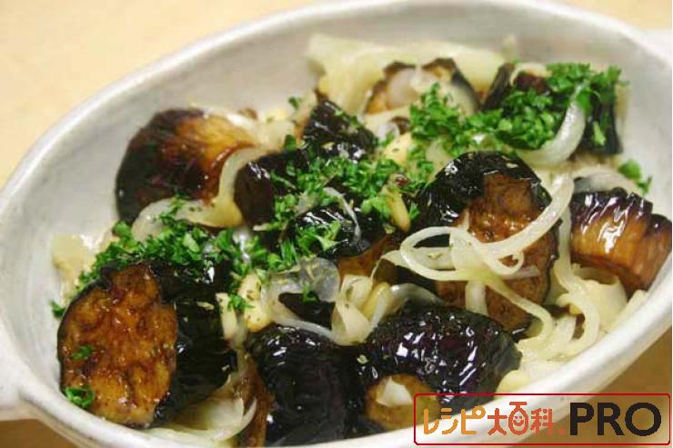 別のフライパンで、常温解凍した揚げナスをたっぷりめのオリーブオイルで、ソテーする。