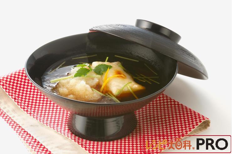 餅を焼いて器に入れ、(1)の汁を注ぐ。大根おろしをのせて、みつばを散らし、ゆずの皮をのせる。