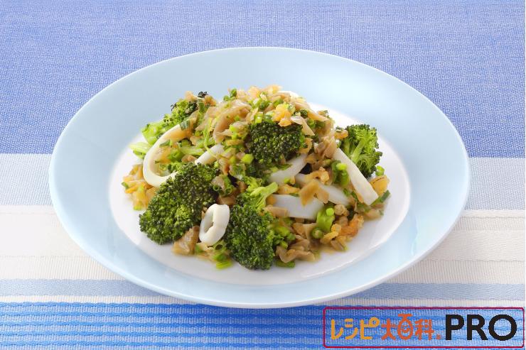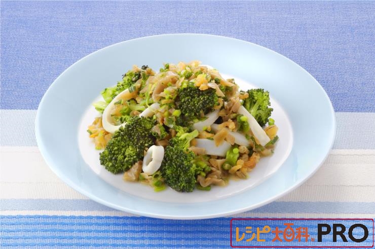 フライパンにオリーブオイル6gを熱し、いか、ブロッコリーを炒め、皿にとる。