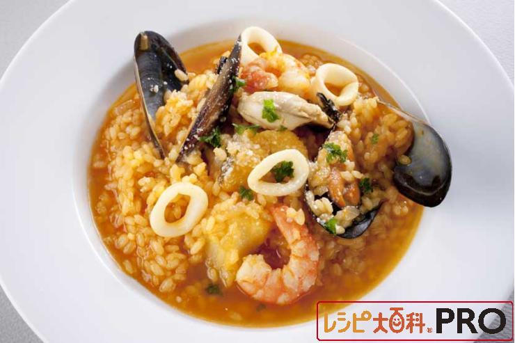 (2)のスープのみを(1)に加え、米を炊いてリゾットにし、(2)の魚介を加える。