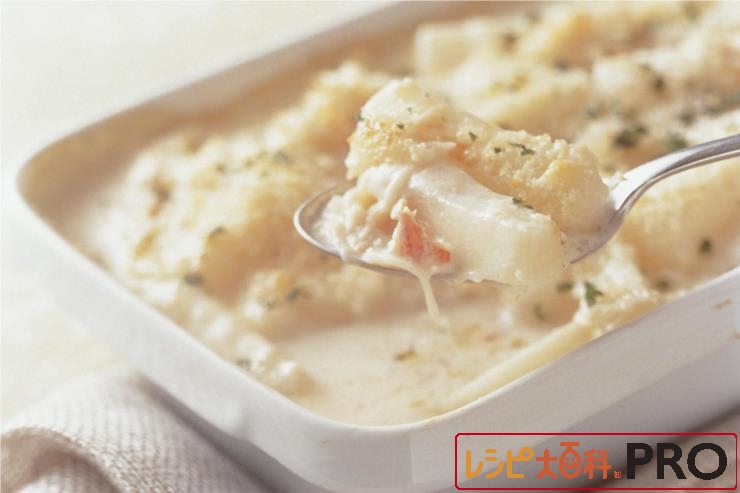 バター(分量外)を塗ったグラタン皿に(4)を並べ、Aをふり、230℃のオーブンで約10分、焼き目がつくまで焼く。