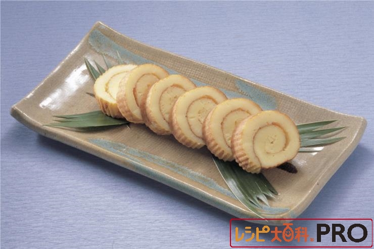 フライパンに油を熱し、(1)を流し入れて両面焼き、おにすで巻いて型を整え、1.5cmに切って器に盛る。