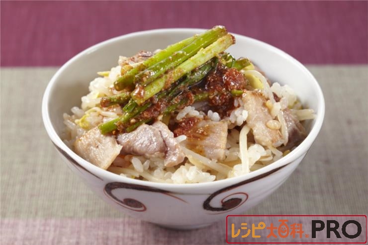 フライパンを熱し、ごま油を入れ、豚バラ肉を炒め、
