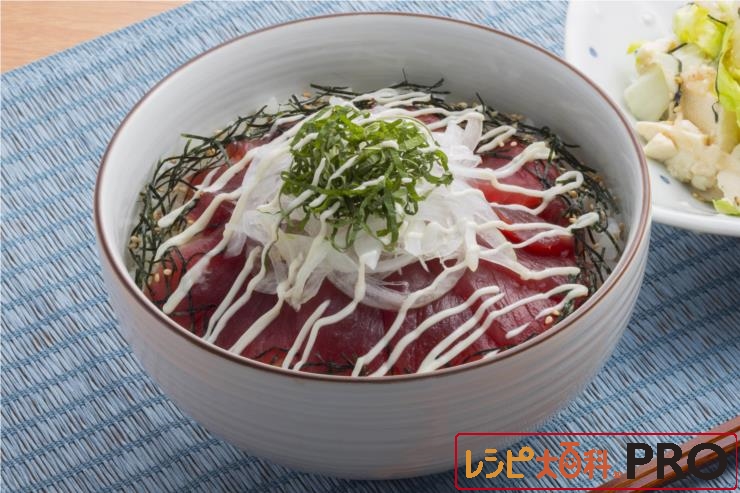 器にご飯をよそい、まぐろを盛り、Bをのせ、Cを飾る。