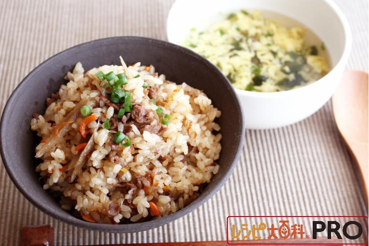 炊飯器に洗った米、(1)の汁を入れ、2合の目盛りになるまで水を加え、(1)の具をのせて炊く。