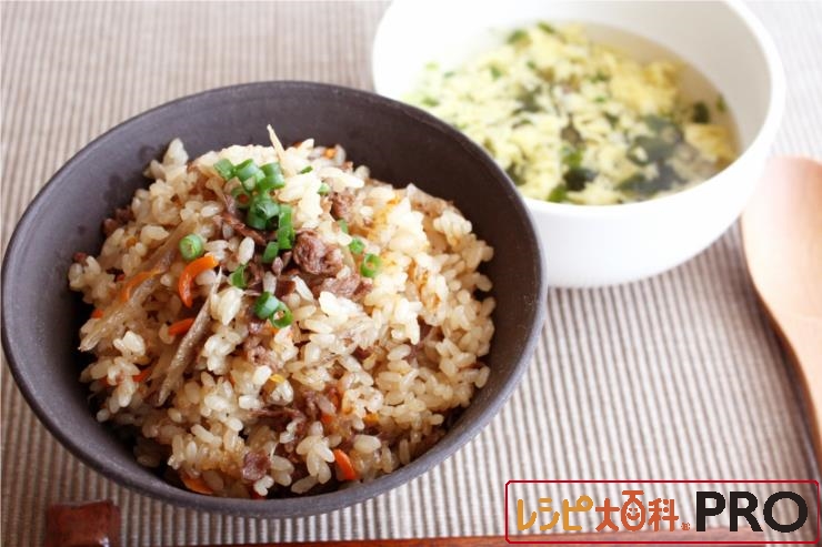 炊飯器に洗った米、(1)の汁を入れ、2合の目盛りになるまで水を加え、(1)の具をのせて炊く。