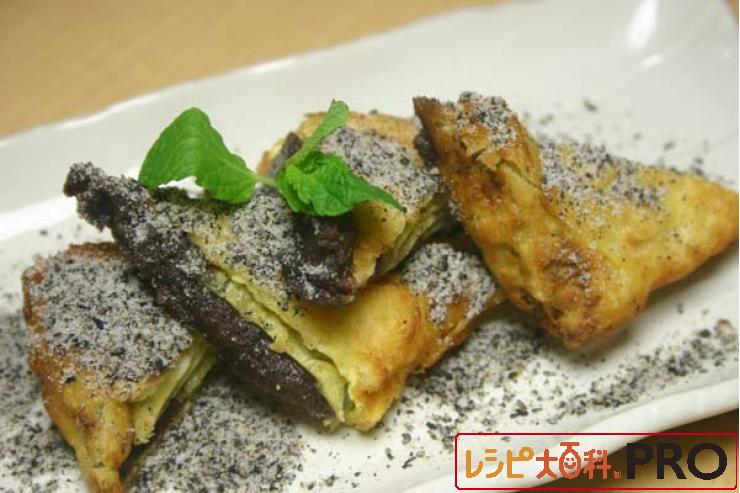 定番の味、あんこ巻きを卵クレープを使って簡単調理。うま味のあるすり胡麻を添えて。
