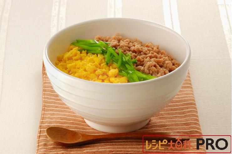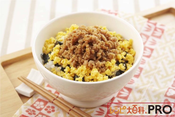 鶏そぼろを作る。フライパンを熱し、油2gをなじませ、いったん火を止めてフライパンの温度を下げ、ひき肉を入れて木ベラでよくほぐす。弱火にかけて充分にほぐしながら炒め、Aを加えて弱火で煮る。煮立ったら3分ほど煮て汁が少し残るくらいまで煮詰める。