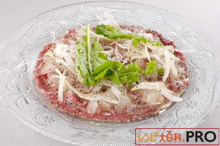 皿にスライスした生食用牛肉を盛り、Aをのせ、(1)のジュレをかける。