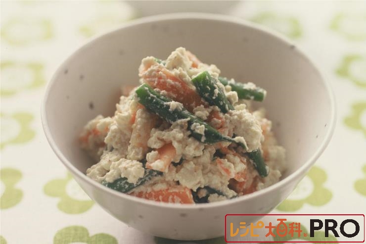 (1)をザルで裏ごしし、大きめのボウルに入れ、Aを加えてよく混ぜる。(2)、(3)を加えて菜箸であえ、器に盛る。