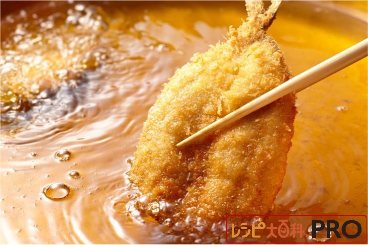 (1)に小麦粉、溶き卵、(2)の順に衣を付ける。