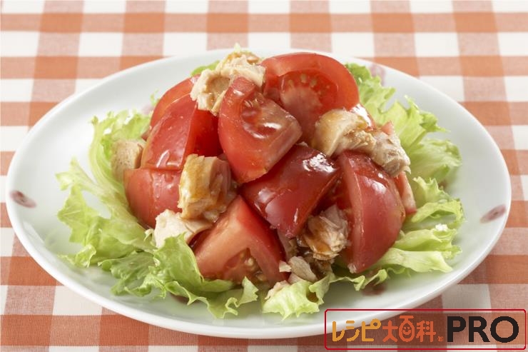 器にレタスを敷き、トマトとツナを混ぜ合わせて盛り、(1)をかける。