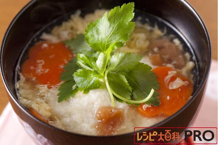 溶き卵を糸状にたらして加え、フワッと卵が浮き上がってきたら、おろした大和いもを加え、しょうゆで味を調える。
