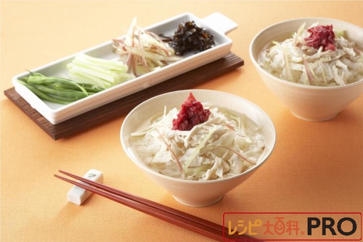 茶碗にご飯をよそい、鶏肉、みょうが、梅肉を順にのせ、(2)のゆで汁をかける。Cを添え、お好みで加える。