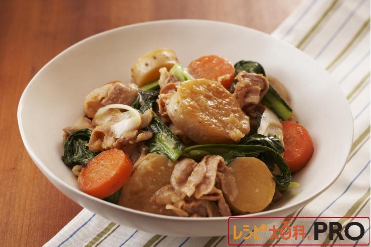 肉に火が通ったらAを加えてサッと炒め、分量の水を注ぎ、「ほんだし® かつおだし」半量を加えて強火で煮立てアクを取り、Cを加えてフタをして中火で約20分煮込む。