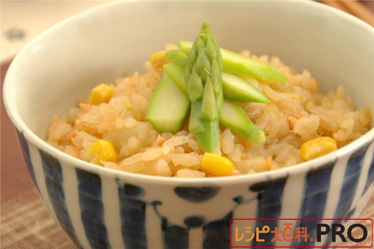 炊飯器に洗った米、じゃがいも、コーン、Aを入れて混ぜ合わせ、酒をまぶしたさけをのせて炊く。