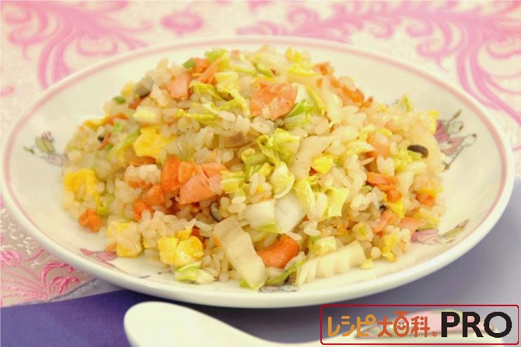 ご飯を加えてさらに炒め、(1)を戻し入れて炒め合わせる。